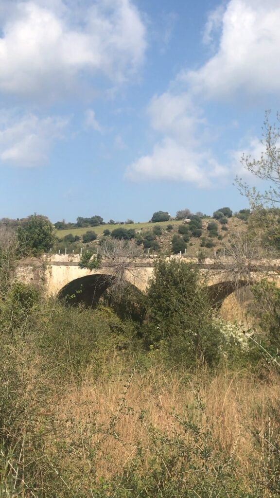Maar nu over de weg. De route is erg mooi en prettig om te rijden. We zitten veel hoger dan verwacht en hebben een prachtig uitzicht. Steeds weer zien we sinaasappelplantages. Het gaat bergop en bergaf. Plotseling zien we een bord bij Melilli: De weg is over 7 kilometer afgesloten. OK. Dat hebben we al vaker gezien. We hebben het eerder gezien. We kijken nog eens goed. We rijden verder. Iets voorzichtiger nu. Plotseling is de weg voor ons afgesloten. Er staat niet alleen een bord, maar een vangrail blokkeert de rijbaan voor ons. Maar rechts gaat een smal, onverhard pad verder. We kijken voorzichtig, het ziet er goed uit. Dit type bypass is typisch voor Sicilië. De eigenlijke weg, meestal een brug, wordt afgesloten omdat hij vervallen is, en er vormt zich een soort gebaande paden als bypass, die na verloop van tijd beter begaanbaar worden en dus ook voor ons busje haalbaar zijn. Vanaf hier hebben we nu zicht op de oude stenen brug, en we zijn blij dat hij gesloten is.
