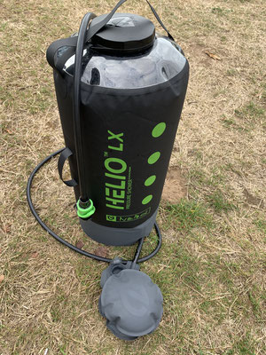 - „Helio Pressure Shower“ von Nemo. – Wir haben leider keine Außendusche verbaut. Nachrüstung war uns zu aufwendig. 22 Liter Fassungsvermögen. Der Wassertank steht tatsächlich auf dem Boden und wird mit einer praktischen Fußpumpe bedient. Die lästige Suche nach einem geeigneten Ast spart man sich einfach. Wärmer wird das Wasser dadurch aber auch nicht. 😉 Link: https://www.globetrotter.de/nemo-outdoor-dusche-helio-pressure-shower-lx-22-1076725/