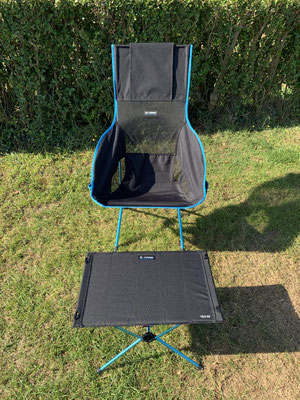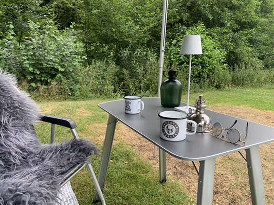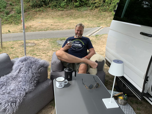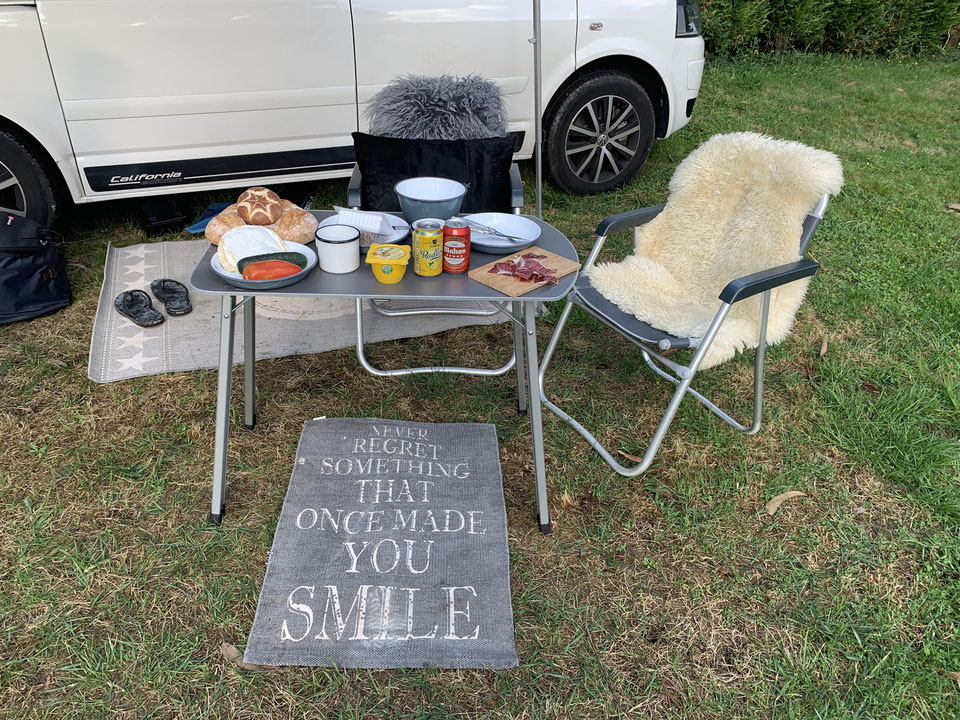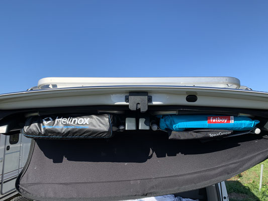 Sur le California, deux chaises de camping sont déjà intégrées dans le hayon arrière. Mais comme nous envisageons d'acheter un SpaceCamper, nous avons cherché une alternative. - Au début, je pensais que les chaises du California étaient une solution idéale. Entre-temps, je trouve la solution du SpaceCamper meilleure. Celui-ci a une tente arrière sous le hayon pour se doucher et se changer. S'il y avait aussi des chaises ici, la hauteur debout serait nettement réduite. De plus, les chaises du California ne sont pas les plus confortables. C'est pourquoi nous avons voulu tester Helinox et nous nous sommes offert la table de camping SUNSET CHAIR plus Table One Hard Top. Helinox n'est pas vraiment bon marché. Mais le poids, l'encombrement et la rapidité de montage nous ont convaincus. Sur le California, elle se range en plus dans le hayon arrière.