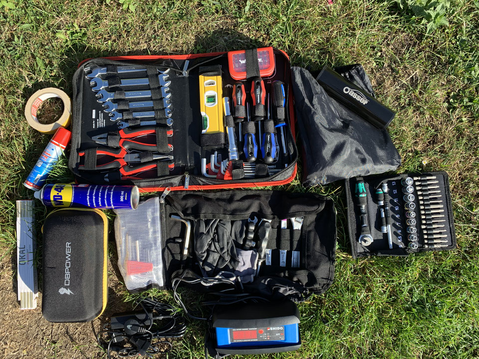 Dans le compartiment du bas (au-dessus de la bouteille de gaz) se trouvent nos outils. WD 40 pour tout ce qui doit glisser, du ruban adhésif blindé pour tout ce qui doit tenir. Du spray pour chaînes pour les vélos.