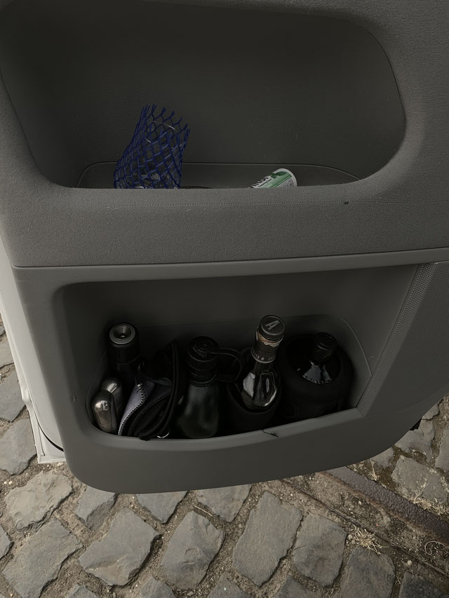 - Bidon de rechange de 10 litres - Actuellement vide, en raison de notre surpoids - En cours d'examen, peut-être plus présent lors de la prochaine tournée. Lien : https://amzn.to/2LRQU7a