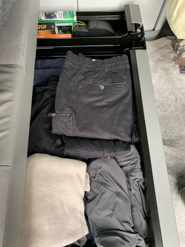 Dans le petit tiroir devant le coin cuisine, nous avons de la place pour notre lampe de table SIGOR Nuindie Akku, notre haut-parleur Bluetooth Bose Soundlink mini II, quelques livres et notre lampe à pétrole de Manufaktum. Nous avons rangé le reste des livres dans le coffre-fort, avec les grains de café Van Dyck. C'est là que se trouvent les objets de valeur. - Dans le Spacecamper, il y a deux tiroirs de même taille sous la banquette. Cela évite les disputes sur la taille des tiroirs.