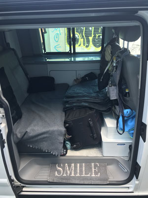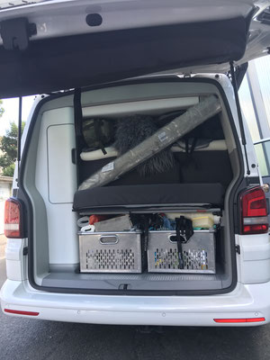 Entre la banquette arrière et les caisses de transport, il reste encore un espace de rangement d'environ 30 cm de profondeur. Nous y rangeons toutes les choses auxquelles nous n'avons pas besoin d'accéder quotidiennement :