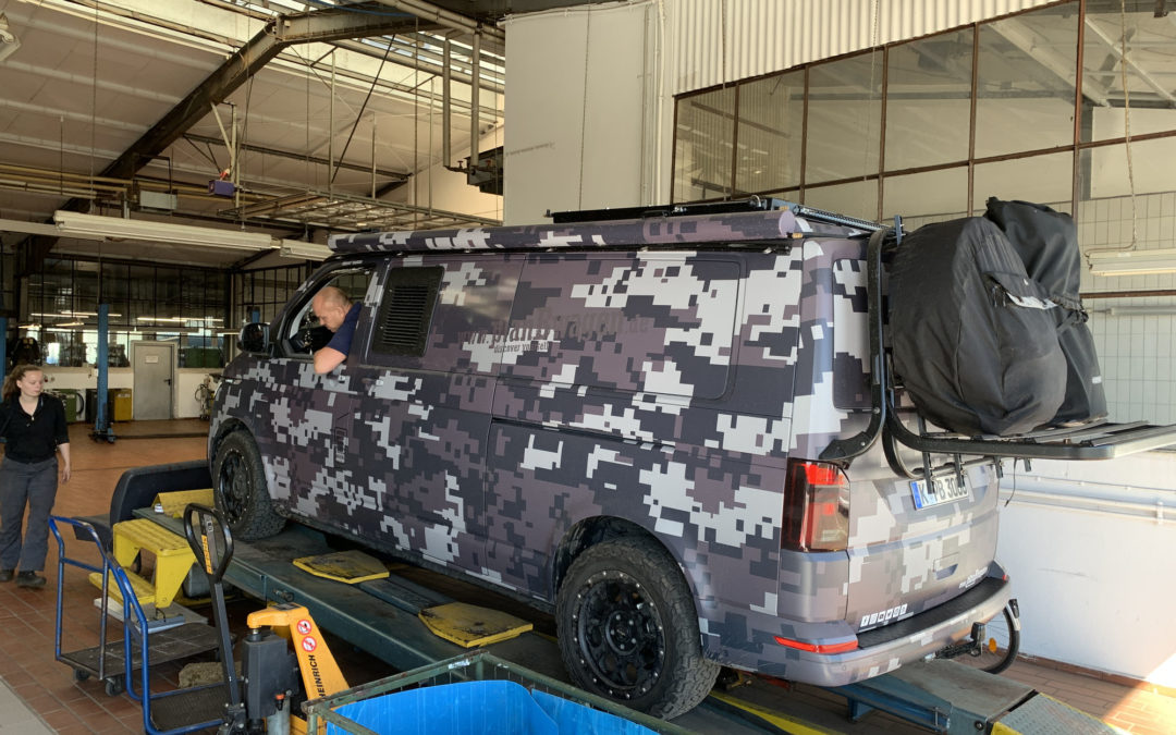 Even na achten vanmorgen komt het langverwachte nieuws. De VW-dealer Schröer, om de hoek, belt. - Onze aandrijfas is geleverd. Dus we pakken snel in en zijn kort daarna ter plaatse. - Het team van de dealer is vriendelijk en zeer betrokken. Maar je beseft ook dat onze bus niet het soort ding is dat hier elke dag binnenkomt. We halen snel onze mobiele telefoons tevoorschijn en beginnen foto's te maken. We nemen het op de koop toe, maar de meester schrikt en beëindigt de fotosessie abrupt. Dus gaan we aan het werk. Maar de installatie duurt veel langer dan de verwijdering. Maar we hebben twee dagen gewacht, dus wat is een paar uur? - Kort na de middag is het zover. Het valt nog te bezien of VW de garantie zal honoreren.