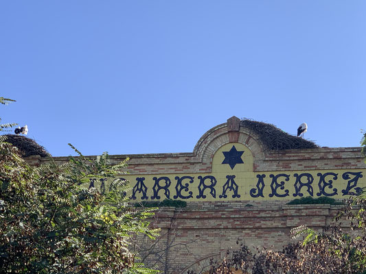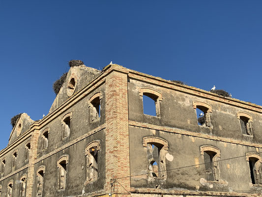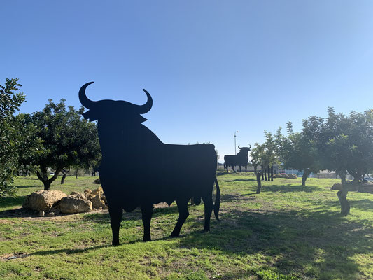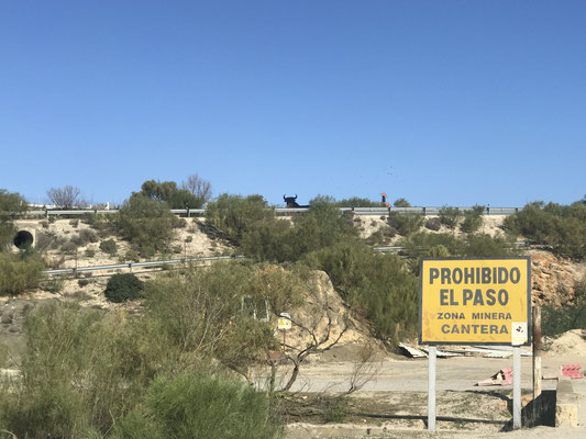 Over geluk gesproken. - Misschien waren het de kleine dingen die ons vandaag bijzonder gelukkig maakten? - Misschien toeval? Als we na een geslaagde wasbeurt naar het zuiden rijden, zien we niet alleen zwermen flamingo's langs de kant van de snelweg, maar ook weer de Spaanse stier. Ik rijd meteen weg om te kijken of ik een foto van dichtbij kan maken. Helaas is dat niet mogelijk. Een paar kilometer verderop zien we de stier weer, evenals Tio Pepe, van vergelijkbare grootte. - Sherry en Osbourne Reklame hand in hand. Ook hier is er geen kans om dichter bij de borden te komen, want ze staan aan de rand van een steengroeve. Er is hier niet alleen een bord verboden te passeren, maar ook een explosief bord, plus Duitse herders. Ik heb altijd geweten dat Duitse herders tegen explosies kunnen. Dat risico nemen we liever niet. En nu voor de tweede keer: We worden niet alleen beloond met een rotonde met meerdere Toros erop, maar 2 km verderop komen we een oude ruïne tegen ...