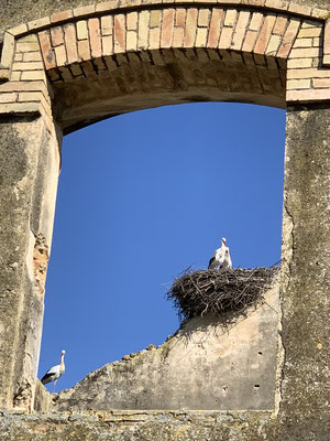 De begane grond van het voormalige fabrieksgebouw is gedeeltelijk bewaard gebleven. Hier bevinden zich nog steeds appartementen en een klein voetbalveld. - De rest van het gebouw, d.w.z. het dak, verlaagde plafonds enzovoort, ontbreekt volledig. Alleen de buitenmuren zijn als skelet bewaard gebleven. Op de voormalige kantelen staat het ene ooievaarsnest na het andere. De aanblik van de ooievaars en het geratel van hun snavels is fenomenaal. Helaas zijn emoties niet in foto's te vangen. In feite doen de foto's van vandaag noch het klooster noch de ooievaars recht. - Bij het klooster* konden we in ieder geval de drone gebruiken, maar we wilden de ooievaars niet storen. We genieten dus nog even van het gekwetter en gaan op weg naar onze bestemming voor vandaag.